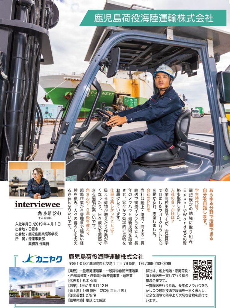 このたび、エフエム鹿児島さんが発行する学生向け就職ガイドブック「かごっまdeきばっど」に、 当社の若手社員である港運事業部・業務課の角 歩希さんのインタビューが掲載されました。
